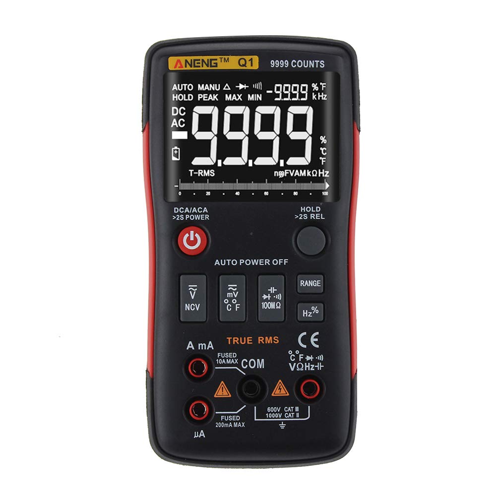 The ANENG Q1 is a 9999 counts True RMS digital multimeter designed for accurate measurement of various electrical parameters. It features an EBTN black screen with a large, backlit LCD for clear readability in diverse lighting conditions. This device supports both automatic and manual ranging, offering flexibility for different measurement needs. It includes an analog bar graph display for quick visual indication of readings.